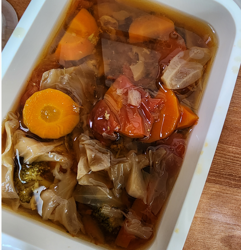 모든 무게는 1:1:1:1인데요 당근 200g, 브로콜리 200g, 토마토 200g, 양배추 200g을 물에 잘 씻어서 썰은 후에 물 800g을 넣고 오쿠 기준 4시간 30분을 가열했습니다.