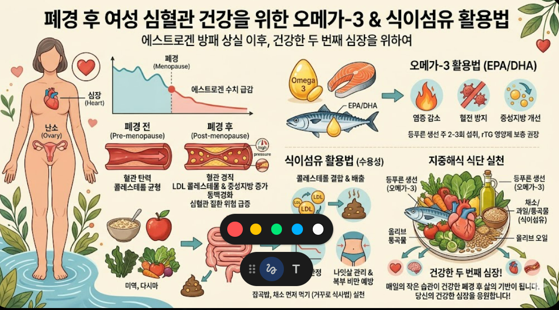 실제로 통계에 따르면 폐경 이전에는 남성의 심혈관 질환 발병률이 훨씬 높지만, 폐경기를 기점으로 여성의 발병률이 가파르게 상승하여 남성을 추월하거나 비슷한 수준에 이르게 됩니다. 도대체 우리 몸에 어떤 변화가 생겼기에 이런 일이 발생하는 것일까요? 오늘은 폐경 후 심혈관 건강을 지키기 위해 반드시 알아야 할 에스트로겐의 비밀과, 이를 대체하여 혈관을 보호해 줄 구원투수 **'오메가-3'와 '식이섬유'**의 똑똑한 활용법에 대해 심층적으로 알아보겠습니다.